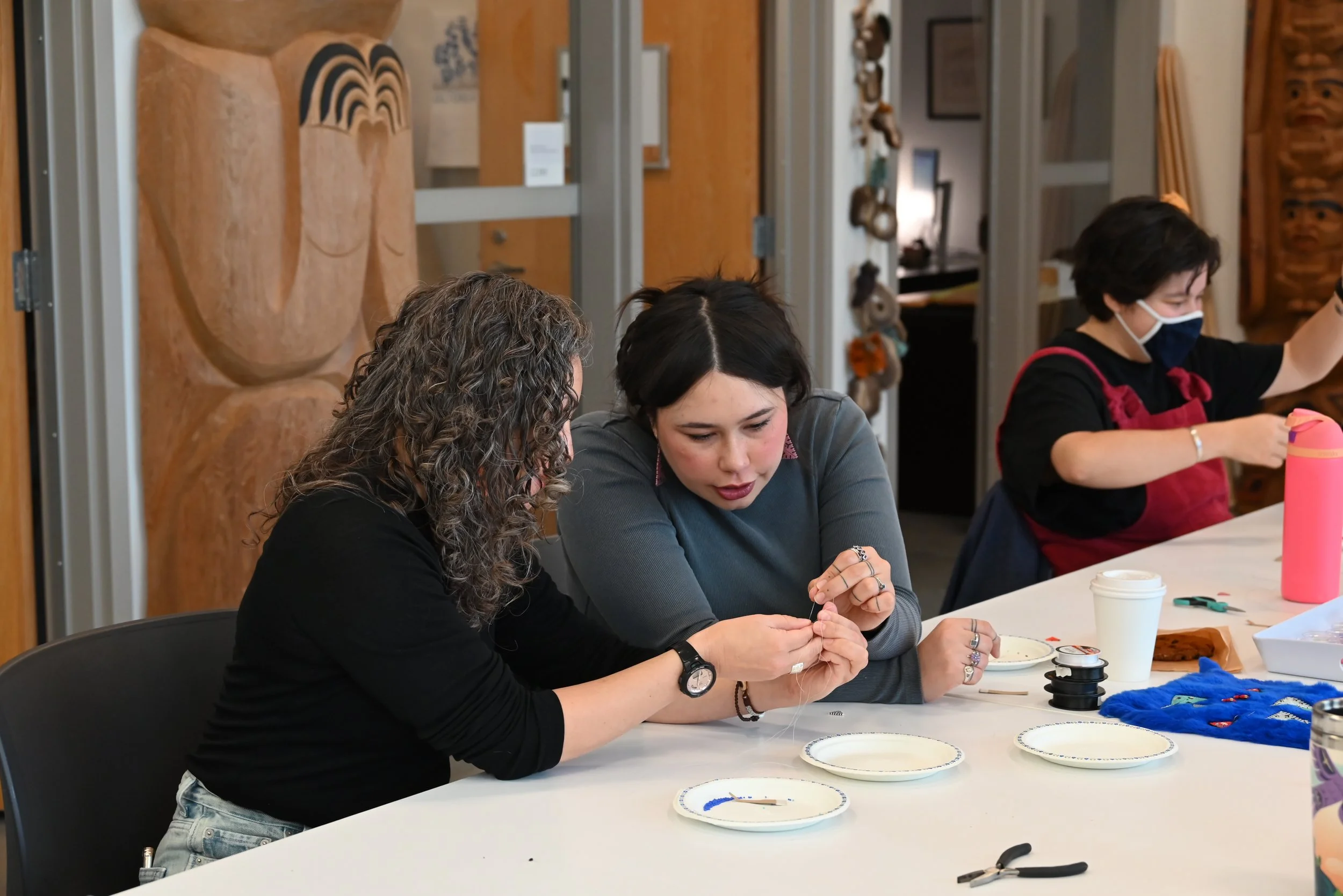 Leanne Inuarak-Dall facilitating an Aboriginal Gathering Place beading workshop, Emily Carr University, October 2025. Photo credit to Sydney Pascal.